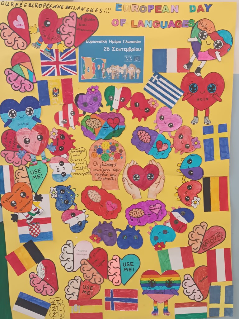 Με θέμα την φράση " Οι γλώσσες ανοίγουν την καρδιά και το μυαλό", οι μαθητές έφτιαξαν τα δικά τους μικρά αποφθέγματα, γεμάτα έμπνευση και χαρά. Έπειτα, ζωγράφισαν σημαίες από διάφορες χώρες της Ευρώπης και δημιούργησαν μια όμορφη αφίσα για να μας θυμίζει ότι οι γλώσσες μας φέρνουν πιο κοντά.